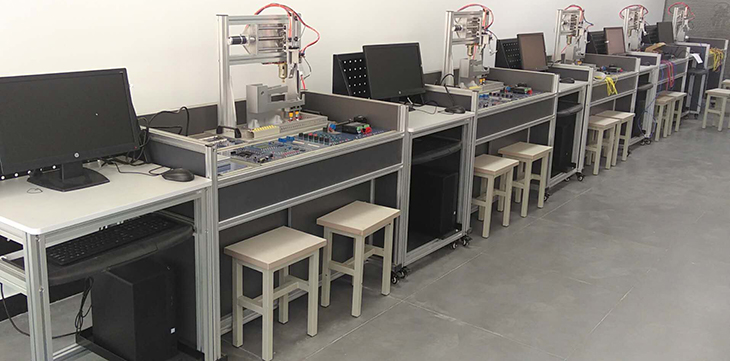 單片機控制功能實訓考核裝置采用烤漆鋼板制作的臺式結(jié)構(gòu)。實訓臺的抽屜柜用于存放實訓模塊,抽屜柜與臺面之間布置實訓模塊安裝支架,最上一層是工作臺臺面。用于技能競賽時在臺面上放置設(shè)備安裝底板,在底板上安裝試題擬定的單片機控制裝置需要的模塊,連接控制電路,編寫的控制程序輸入單片機后,按下運行指令開關(guān),單片機控制裝置就按程序運行。