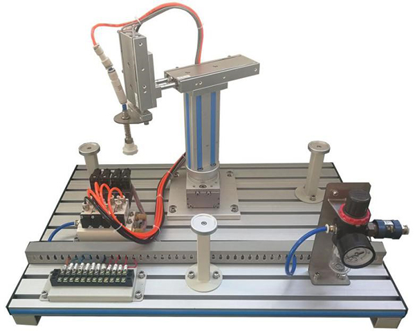 模型由回轉(zhuǎn)氣缸、雙軸氣缸、單軸氣缸、吸盤、真空發(fā)生器、電磁閥、節(jié)流閥、手滑閥、減壓閥、磁性開關(guān)、機(jī)械部件、工業(yè)鋁合金型材底板等組成,設(shè)有兩個抓取工位,可進(jìn)行工件取放控制練習(xí)?砷_展對氣動機(jī)械手的操作及編程控制訓(xùn)練。配有空氣壓縮機(jī):靜音無油,工作電源AC220V±10% 50Hz,輸入功率0.68kW;公稱容積24L,理論流量:116L/min,額定輸出氣壓0.7MPa。