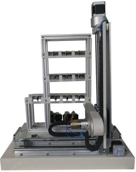 模型包含三層九倉位庫體、出/入庫倉位庫體、三維(X、Y、Z)運動機(jī)械及電氣控制等部分組成;定位執(zhí)行機(jī)構(gòu)由豎軸和橫軸組成;驅(qū)動機(jī)構(gòu)由步進(jìn)電機(jī)及步進(jìn)電機(jī)驅(qū)動器組成;傳動軸為滾珠絲桿傳動和雙軸導(dǎo)軌帶傳動,傳動平穩(wěn)。取物軸由直流減速電機(jī)驅(qū)動,可實現(xiàn)前后兩方向的運動。 |