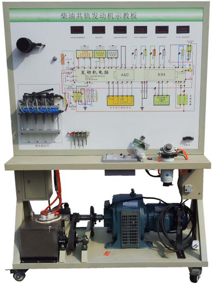 1.真實(shí)可運(yùn)行的共軌柴油發(fā)動(dòng)機(jī)燃油噴射系統(tǒng),充分展示燃油噴射系統(tǒng)的組成結(jié)構(gòu)和工作過(guò)程。電機(jī)驅(qū)動(dòng)曲軸位置信號(hào)輪,可演示電子燃油噴射工作情況。