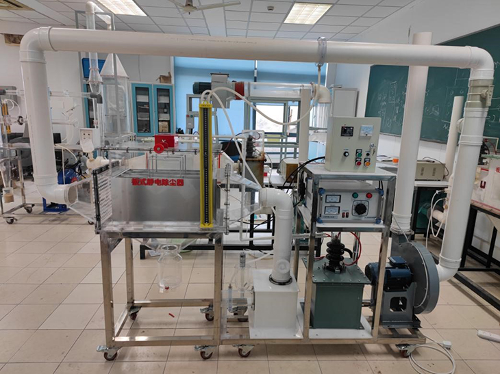 離心風(fēng)機、旋風(fēng)分離器、袋式除塵器、靜電除塵器、高壓靜電發(fā)生器、機械振打裝置、風(fēng)量調(diào)節(jié)閥、發(fā)塵箱、集塵裝置、管路、U型壓力計、畢托管流量計、振動電機、電路控制柜、不銹鋼框架
