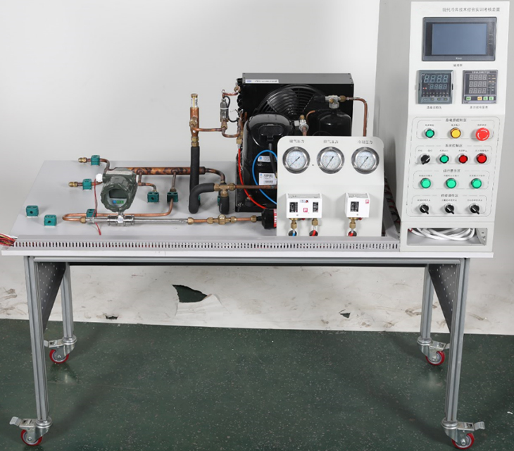 主要由冷凝機組、光管式蒸發(fā)器、冷風(fēng)機、高低壓開關(guān)、電子膨脹閥(或電磁閥與熱力膨脹閥組合)及能量調(diào)節(jié)閥等通過管路連接,組成一個完整的制冷系統(tǒng)。為滿足競賽(實訓(xùn))要求,工作臺安裝板和側(cè)板采用中纖高密度纖維板,學(xué)員可在上面自由安裝制冷元器件、手閥、電磁閥、接線盒、表組等配件(大件已提前固定好,如冷凝機組、電氣控制箱等),系統(tǒng)管路由學(xué)員自己發(fā)揮搭建,也可參照說明書上的效果圖進行組建。機組架由美觀結(jié)實的型材組裝而成,并配有帶剎車萬向輪,方便調(diào)整設(shè)備的擺放位置。