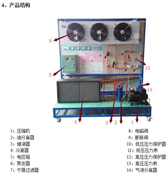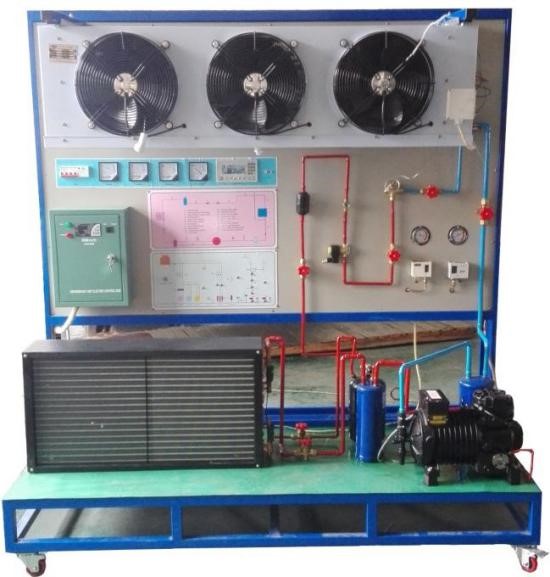 工業(yè)制冷系統(tǒng)實訓考核裝置主要由半封閉式制冷壓縮機、冷凝器、蒸發(fā)器、膨脹閥和故障設置開關、測試儀表等組成。實訓臺通過手閥開關和鈕子開關分別來設置管路系統(tǒng)和電控系統(tǒng)的 20 多種故障。設備采用先進的電控系統(tǒng)并具有具有開相,缺相, 過流等保護功能。蒸發(fā)器風扇采用變頻器控制速度。配備 8 路溫度計,電壓表,電流表,功率表,功率因數表和壓力表,能實時觀察運行參數